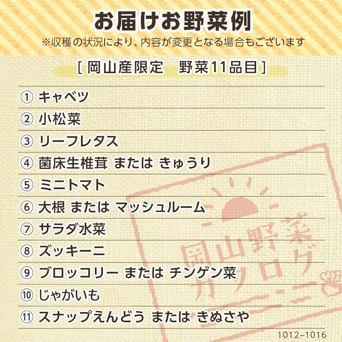 ■すべて岡山県産:岡山県内で収穫された新鮮なお野菜をお届け。契約農家さんから慣行栽培野菜を毎日自社で集荷し、箱詰め後出荷しています。お客様へ「素早く」「鮮度の良さ」をお届けいたします。