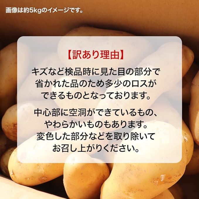 - 訳あり理由:キズなど検品時に見た目の部分で省かれた品のため多少のロスができるものとなっております。 中心部に空洞ができているもの、やわらかいものもあります。変色した部分などを取り除いてお召し上がりください。